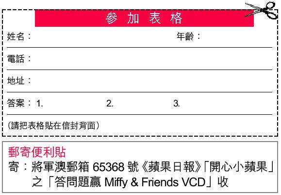 《Miffy&Friends》的故事源自DickBruna最受歡迎的兒童書籍,講述發生在Miffy同他的朋友仔身邊的故事,天天新鮮有趣,引領小朋友一同去認識及發掘身邊的世界,探索多方面的情感,培養德智體群美育,增進知識。最適合2至6歲小朋友收看的3D動畫學習節目《Miffy&Friends》雙語版本,最新推出一套八集VCD,內裏有更多英文詞彙給小朋友學習運用。想欣賞咁精采的3D教育學習動畫,只要看圖回答問題,大獎1名可獲得由新格媒體(香港)有限公司送出的全套八集VCD,其餘9名幸運兒也可以獲得《Miffy與三棵聖誕樹與其他精彩奇遇》VCD乙隻。