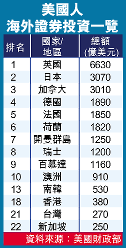 美國人最愛投資於英國資產,截至去年底的持有量達6630億美元;其次是日本資產,持有3070億美元;香港資產則排第18位,持有量380億美元(約2964億港元);台灣和新加坡分別排21和22位。