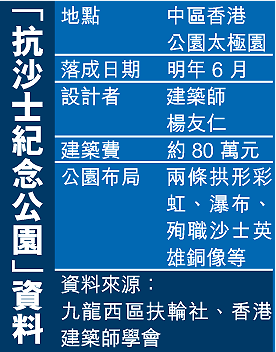 【本報訊】沙士疫潮過去已一年半,港人早從逆境中自強過來。不過,觸目驚心的對抗沙士一百日、為救人而犧牲性命的沙士英雄、市民對抗疫潮的團結力量,總叫人不能忘懷──這一切將展現於明年六月落成、位於香港公園太極園的「抗沙士紀念公園」中。公園布局將包括展現生氣的彩虹和瀑布,以及七尊殉職沙士英雄的雕像。 記者:陳倩雯