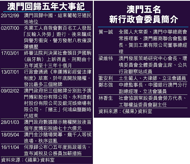 【本報訊】澳門回歸五年經濟顯著改善,但政治及民主化卻沒有長足發展,學者認為,在以和為貴的社會氣氛及傳統下,澳門政府無壓力加快民主步伐,亦有學者指澳門中產階層逐漸成型,如何紓緩他們要求開放政治及參政渠道,將是何厚鏵政府未來五年面對的主要挑戰。