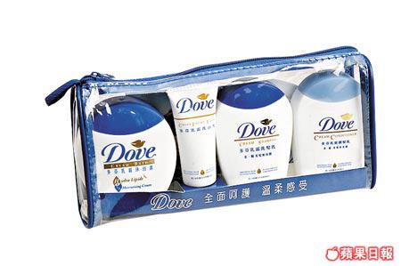 Dove旅行套裝,一包有齊洗面乳(15克)、沐浴露(50毫升)、洗髮水(50毫升)及護髮素(50毫升),各含4乳霜,滋潤又保濕。