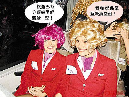 「起飛」啦!易服「空姐」邊介紹旅遊點,名副其實的「空中少爺」邊送來香檳小食(只限頭等乘客)。忽然「空姐」叫我們看櫈底,打開──吓!假髮?對,易服遊,你不女扮男裝也得戴個假髮湊熱鬧!之後更要在狹窄車廂內跟「空姐」學跳舞!更精采是「飛機」降落悉尼歌劇院,我們都戴住騎呢假髮落「機」,李察重陪埋大家癲,在劇院前齊起舞!