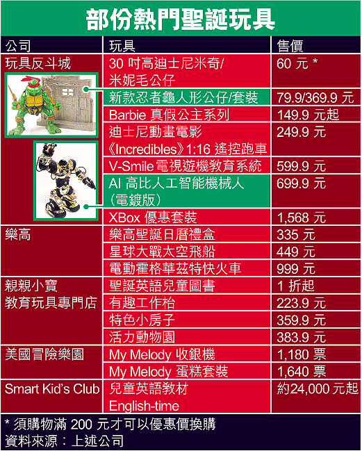 玩具反斗城區域採購經理白禮仕表示,今年聖誕節該店推出多款聖誕玩具,計有明年上映的迪士尼動畫電影《TheIncredibles》(超人特攻隊)一比十六遙控模型跑車、AI高比人工智能電鍍機械人、忍者龜、三十吋高的米奇及米妮毛公仔等,適合不同年齡的小朋友。