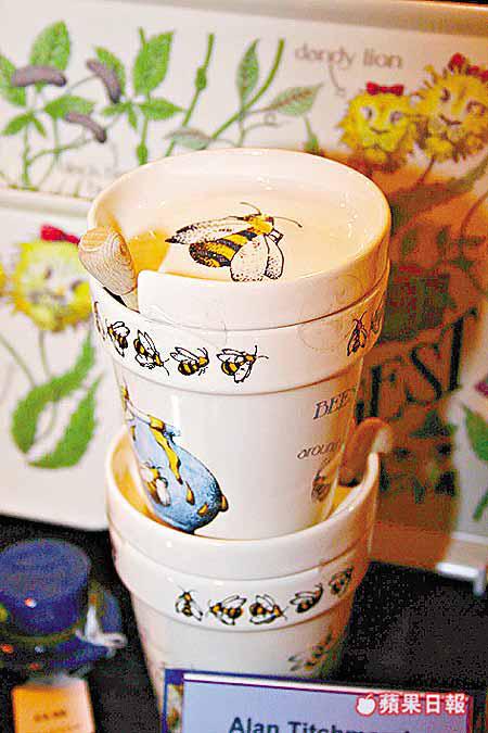 英國人熱愛園藝,在花園會使用特別設計的餐具來盛載熱茶及餅乾;這批印有英國漫畫家AlanTitchmarsh作品的蜜糖杯(圖)及茶杯售價約140港元。