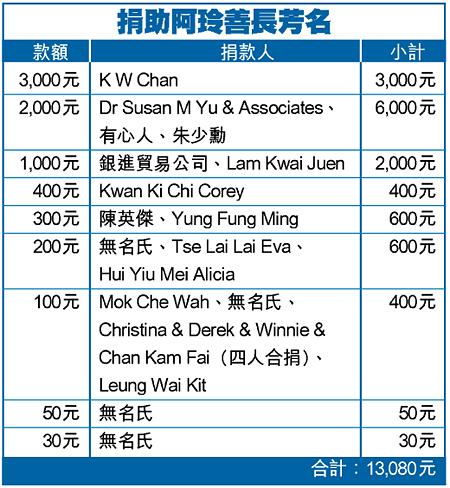 三十一歲的單親婦阿玲,與四歲女兒相依為命,母女依靠綜援金維生。早前,其五十七歲父親林先生在內地工作期間不幸猝死,阿玲一度無力殮葬亡父,蘋果日報慈善基金曾從「殮葬專戶」撥款一萬元協助。 近日,記者另把讀者捐款合共一萬三千零八十元轉交她,減輕其經濟負擔。 捐款編號:C1535