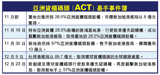 本月初,杜拜港務局擊敗PSA,成功向CSX母公司購入CSX全球港口業務,作價高達12億美元(93.6億元)。杜拜銳意發展亞洲港口業務,乘着購入CSX交易,間接持有ACT近20%股權。杜拜港務局更行使股東優先權,將PSA摒出香港碼頭市場。