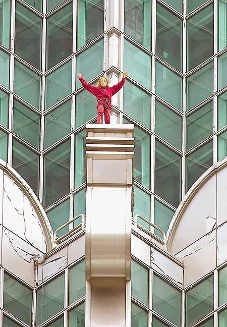 亞蘭羅貝爾攀爬至九十一樓時,曾一度在大廈外牆凸出的地方休息,吃了朱古力及飲水補充體力,並研究爬上大廈頂部尖塔的辦法。至下午二時,亞蘭羅貝爾終於爬上塔尖,成功打破了他九七年登上四百五十二公尺的吉隆坡雙子塔的紀錄,前後用了四個多小時,比最初原定時間多了個半小時。
