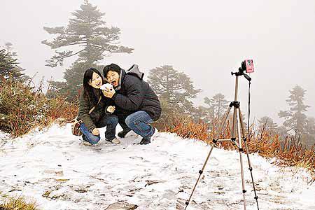台灣人今年過了一個白色聖誕!由於台灣南山區有雨,溫度又跌至攝氏零度,著名旅遊勝地南投縣玉山及合歡山連續兩天落雪,有民眾昨日清晨特地騎電單車上山賞雪,不久座位上即結了薄薄的冰霜(圖一);也有來自外地的情侶,捧起雪球,張開嘴巴高興地「嘗雪」自拍(圖二)。 楊靜茹攝