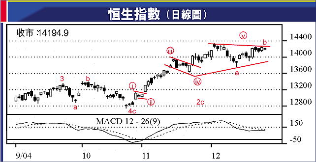 以波浪理論分析,目前已進入(4)浪整固,該浪特色為反覆上落,常以3-3-3-3-3作a、b、c、d、e浪運行,即a浪以1、2、3個小浪回落,b浪以1、2、3個小浪反彈,而實際暫時正是如此,即自恒指14339點,a浪跌至13760(12月13日),即以1(14150)、2(14317)、3(13760)下調,而b浪反彈至上周二最高14260,亦以1(14137)、2(13905)、3浪升至14260。