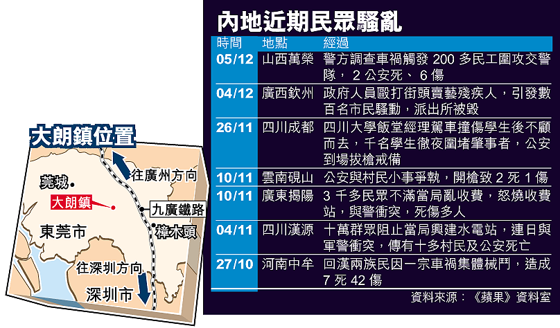 東莞大朗鎮昨日爆發大騷亂。事件起因是一宗簡單的盜竊案,最後釀成逾萬村民及民工暴動,當局從東莞市緊急調動幾百名防暴警察及特警到場鎮壓,並發射催淚彈驅散人群,事件中至少有數名村民死亡,近百人受傷,數部警車被推倒及焚毀。