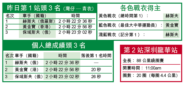 香港隊的黃毅程昨得第七名,其餘年輕港將則發揮一般。今日將移師深圳進行第二天八十八公里繞圈賽。