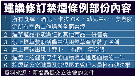當局在今年第二季向立法會提交建議修訂《吸煙(公眾衞生)條例》草案,全面擴大禁煙範圍,除了麻雀館、商營浴室及興建中樓宇獲豁免外,所有室內工作場所包括後樓梯及廁所範圍均全面禁煙,並有三個月至一年寬限期。政府消息人士強調,當局會加強現時只三十人的控煙辦公室人手,賦予人員執法權力(修例建議詳見附表)。