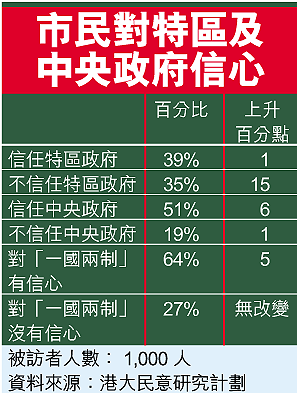 另外被訪者對中央政府信任程度明顯上升六個百分點,達五成一,而對「一國兩制」有信心的人就有六成四,上升六個百分點。