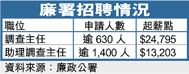 申請「助理調查主任」一職的求職者逾一千四百人。廉署指出,超過一半申請人持有學士學位,其中五十名投考者另又擁有碩士學位。與○三年十二月份的招募情況比較,廉署表示,當時聘請逾四十名調查主任或助理調查主任,結果接獲三千七百八十人申請。薪金方面,受到公務員減薪的影響,廉署指出,調查主任的起薪點為每月二萬四千七百九十五元,助理調查主任的起薪點則是每月一萬三千二百零三元。