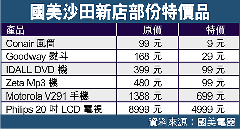 國美電器廣宣部經理鄺佩霞昨日表示,今次是公司首次在新界區設立分店,選擇沙田新城巿廣場一期六樓相連兩個店舖,佔地八千平方呎,屬於商場最大的電器店;公司為慶祝沙田分店開幕,新店今早九時推出大特賣,逾五千件產品低至一折起,計有售價九元的風筒、十九元的熨斗及電飯煲、九十九元的火鍋爐、六百九十九元的手機等。