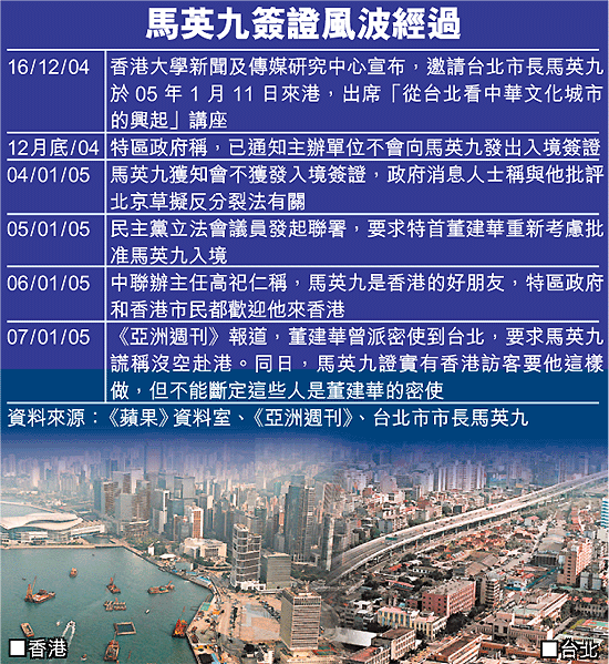 《亞洲週刊》昨天報道,北京早於上月已批示港府,不給馬英九發簽證,於是董建華派密使到台北告訴馬英九,要求他對外說謊,宣稱因「自己抽不出時間」無法赴港,這令馬英九非常不悅,拒絕配合說謊。