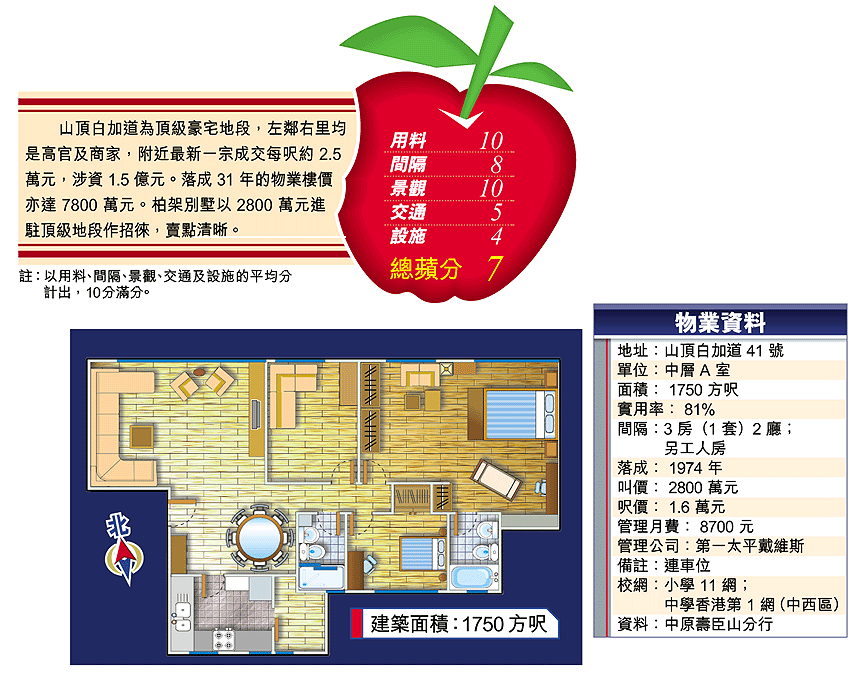 中原壽臣山分行黃芷羚表示,與柏架別墅同樣細價兼享維港景的物業,還有坐落較近山頂的柯士甸山道及種植道的豪宅,地段稍遜之餘,絕大部份樓齡達四五十年。至於白加道上豪宅,近期成交包括全新的白加道31號B座洋房,面積5995方呎,1月份以1.48億元沽出,呎價24687元。另白加道27號Altadena頂層複式,4500方呎,04年7月以7800萬元易手,呎價17333元。
