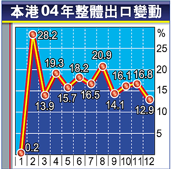 政府發言人表示,去年12月商品出口繼續強勁增長,主要反映香港對外貿易行業持續蓬勃。星展銀行高級投資策略顧問陳寶明認為,12月份本港轉口貿易表現理想,顯示期內仍有急單需求,海外市場表現仍然強勁。他相信,05年增幅會較04年放緩,原因是環球經濟增長放慢及美元維持弱勢,估計05年整體出口增幅可逾11%。