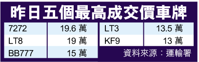 運輸署昨日推出二百四十個車牌,無字頭車牌「7272」以十九萬六千元成交,為全日最高價的車牌。但當中也有不少車牌因無人出價而被迫收回。