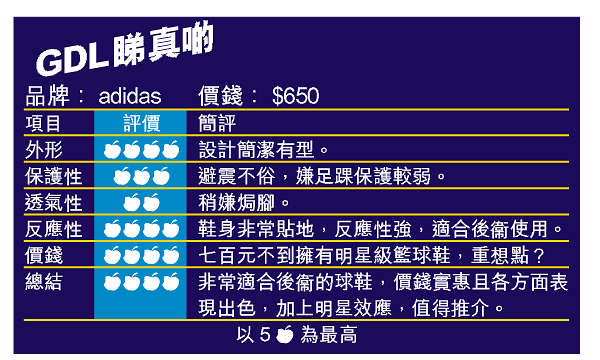 總括來說,如果你是以速度搵食的球員,又習慣低筒籃球鞋,GDL是一個不錯選擇;還有請於三間牌網頁欣賞比立斯的GDL廣告,勁有型!