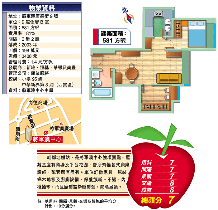 中原區智輝說,將軍澳中心五百餘呎單位,金額用不着200萬元,佔每月成交近半。9座中層B,581方呎,園景,上月以184萬元轉手,每呎3167元。細碼盤有90個,叫價視乎景觀而定,望居屋樓宇每呎3200元,園景3400元。