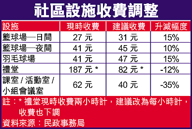 【本報訊】政府擬調整二百多項「對民生沒有直接影響」的服務收費,包括多項社區設施時租費用。籃球場及羽毛球場建議加價一成至一成半,調整依據是按照用者自付原則。有立法會議員反對增加文康場地收費,以免加重市民康樂活動的負擔。 記者:蔡元貴