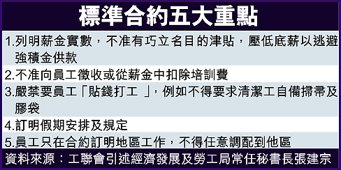 至於假期方面,標準合約規定僱主訂明假期安排,以杜絕員工被剋扣休息日及法定假期。此外,日後合約會列明僱主不得任意調配員工到不同地區工作,勞工處會要求承辦商公開張貼標準合約及部門舉報熱線電話。