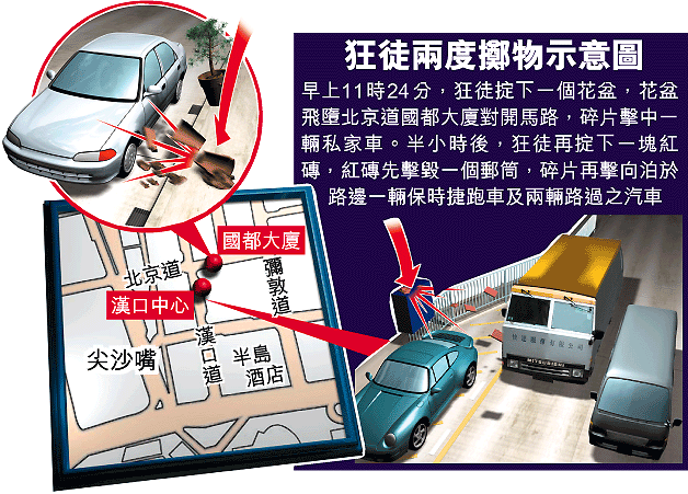 【本報訊】尖沙嘴遊客區出現擲物狂徒,昨晨半小時內北京道及漢口道一個相連街口先後發生兩宗擲物案,狂徒將花盆及磚塊擲下,碎片擊中四輛路過及停泊上址私家車和解款車,事件中無人受傷。目擊者稱,事前曾看到一名可疑男子在附近國都大廈天台擲物,警方趕至天台搜捕未有發現,正部署緝捕行動。 記者:梁偉權 羅振輝 冼豪文