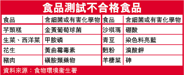 新年常食用的生菜及西洋菜也有問題,該署在一個生菜及一個西洋菜樣本中發現禁用農藥甲胺磷、在元朗錦田一士多購買的散裝紅泥花生含遠超法例上限的黃曲霉毒素、一個豬肉樣本含磺胺類藥物、一個青豆樣本含禁用染色料亮藍、兩個麵粉樣本含禁用添加劑溴酸鉀、一個沙琪瑪樣本含硼酸及兩個羊棲菜含高量的砷。