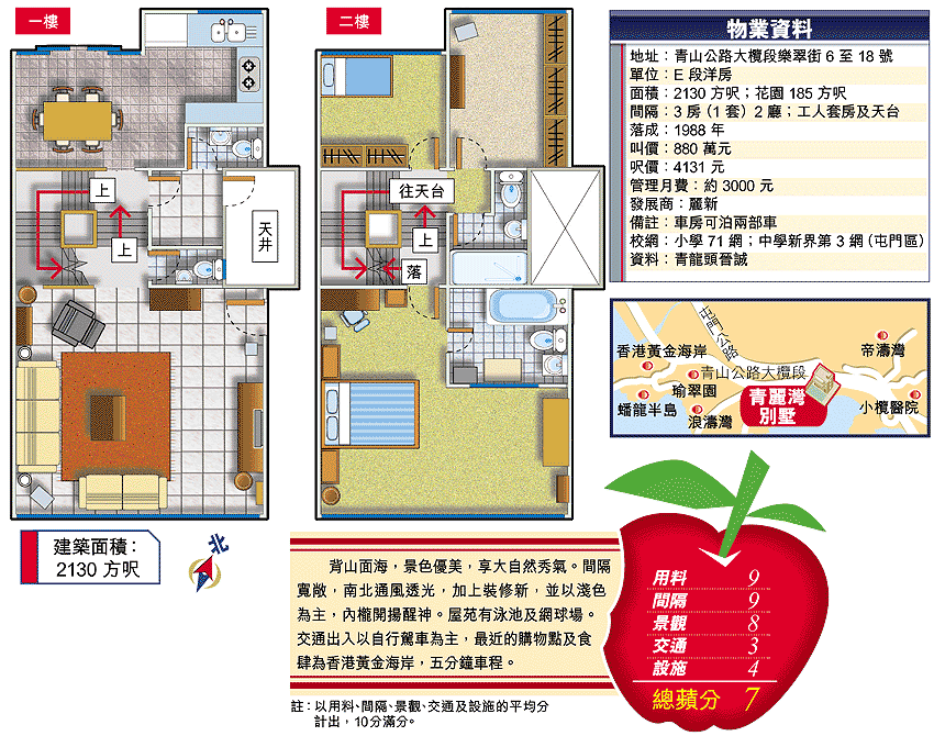 晉誠張秋說,青麗灣別墅具規模,戶戶逾二千呎,上月有兩宗成交,分別為B及D型屋,以每呎3000及3400餘元易主。屋苑放盤少,這個更是唯一的E型,備車房、享海景及新裝修等多項優點。缺點則是須要繞道A至D型屋那方,才可享用泳池及網球場設施。