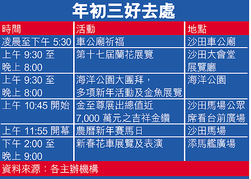 另外,馬會有多項特備節目讓馬迷歡度新春假期,將有三件合共用了三百二十一公斤黃金及逾百萬顆美鑽寶石製作、總值七千萬元的巨型黃金美鑽展品,在沙田馬場首次同場展出,包括價值一百二十萬元的鑽石金雞與價值七百三十萬港元的至尊金風車,將在馬場火車站平台讓馬迷拍照及轉大運。