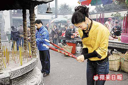 昨日車公誕,名模樂基兒日前已到沙田車公廟上香,祈望轉走年底的是非。首次入廟拜神的樂基兒,不諳轉風車,又拗斷塔香,笑料十足。