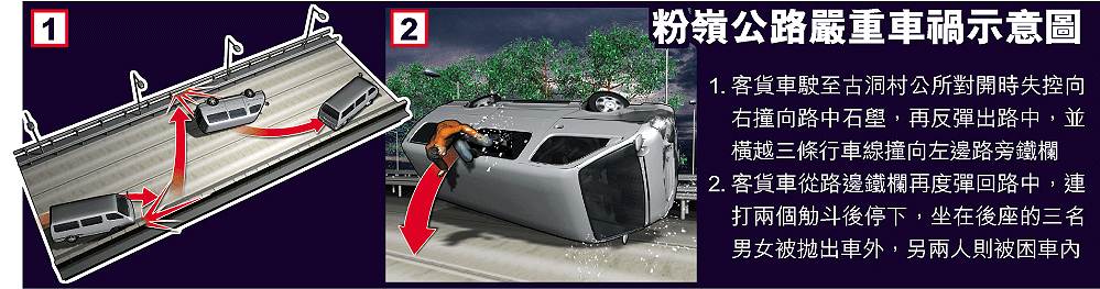【本報訊】上水古洞粉嶺公路大年初二凌晨發生嚴重車禍,一輛載着五名男女的客貨車懷疑司機酒後駕駛失事,猛撼路中石壆後,如「碰碰車」般反彈衝向路旁鐵欄,然後再彈回路中翻滾,打了兩個觔斗後全車毀爛,坐在後座的三名男女被拋出車外重傷,另外兩人則被困車內。警員及救護員到場,將五名傷者送院急救,當中一對男女情況危殆,一人情況嚴重,另外兩人情況穩定。 記者:王偉禎、伍浦鋒