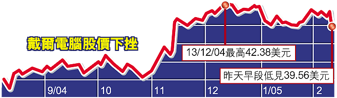 由於戴爾對今季營業額預測差過預期,戴爾股價昨天早段一度挫至39.56美元,跌4.8%。