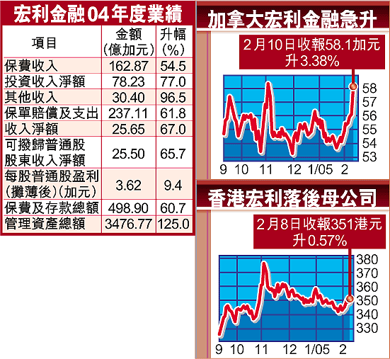 宏利全年每股盈利3.62元,升9.4%;第四季度普通股息每股派0.26元。截至04年底內含價值279億元,升81%;由於股東數目增加,內含價值每股升幅僅10%。期內保費及存款總額498.9億元,升61%,當中獨立基金存款佔50.3%,升42%;人壽及醫療保險保費佔25.9%,升57%。
