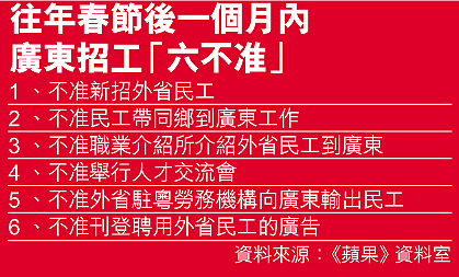 廣東當局為控制春節後的南來人潮,於一九九五年頒布新春招工「六不准」政策,包括禁止企業在農曆新年後一個月新招外省民工等(見表)。不過,隨着廣東去年爆發「民工荒」,勞工短缺,廣東省勞動和社會保障廳於是決定,取消實施多年的「六不准」規定。