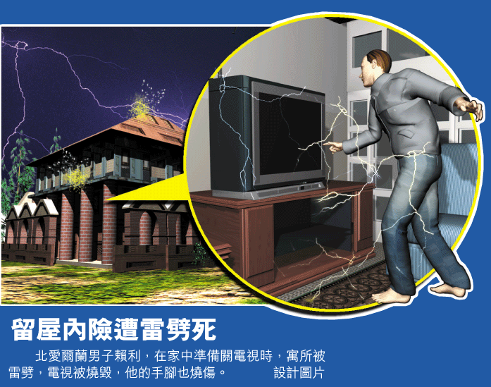 原來,賴利的寓所被雷電擊中,全屋損毀嚴重,不但屋頂石屎剝落,屋內電插座和電視都被燒毀,他七歲女兒的睡房更發生小火,他則全身被電流通過,手腳燒傷送進醫院。醫院的醫護人員相信,他是因為「電流由手部通往腳部」而被燒傷。