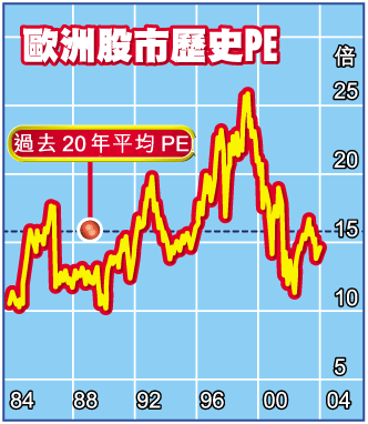 雖然歐元區經濟增長未如理想,但由於歐洲股市仍存在着不少正面因素,因此,投資者亦毋須過份悲觀,歐股仍有一定的投資價值。即使歐洲股市自2003年3月的低位已反覆上升了逾50%,但在強勁的企業盈利增長支持下,歐洲股市估值卻更見吸引。現時,歐洲股市往績市盈率僅為14.5倍,較2003年3月更低,同時亦較過去10年平均值折讓近2成。