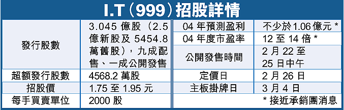 上市後沈嘉偉家族仍持有約67.2%權益。減持的股東為03年入股的基金SCM,上市後該基金仍會持有約2.3%或2337.7萬股,禁售期限為3個月。集資所得,8500萬元將用於償還債務、2.8億元擴充本港銷售網絡、6000萬元在內地及台灣開設銷售點。I.T昨日開始國際配售,下周二公開招股,下月4日於主板掛牌。