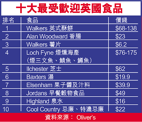 英國之最食品節今起至下月底在Oliver's(利華精美食品店)舉行,囊括一千二百四十多款英國食品。Oliver's按銷量選出十大最受歡迎英國食品,Walkers英式酥餅排眾而出,店舖經理劉志健說,英式酥餅(shortbread)是英式下午茶常見點心,口感鬆脆,「啱晒下午鍾意食少少嘢嘅英國人。」