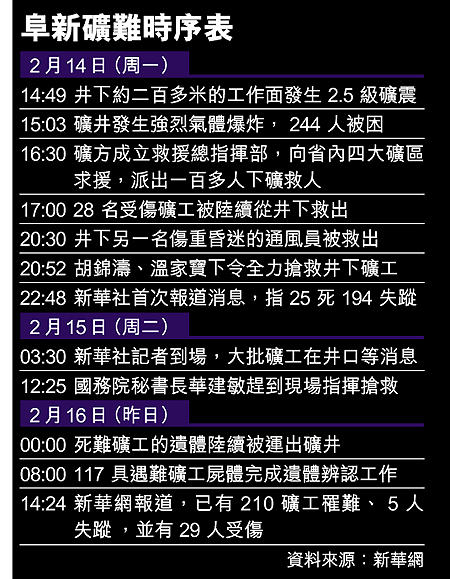 遼寧省阜新市孫家灣煤礦海州立井,前日發生建政以來死亡人數最多的礦難事故後,死亡人數已升至二百一十人,仍有五人下落不明。