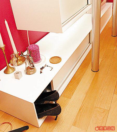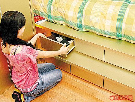 睡房面積不大,江小姐盡量利用有限的空間,除一個大衣櫃擺放個人物件外,睡床還用了現時相當流行的兩層地台設計,外邊有兩層櫃桶,方便放衣履雜物,床板有油壓鉸,可打開,用盡內裏儲存空間,床邊放一盞彩色小床頭燈,既方便晚上出入,也替平平無奇的睡房添一分色彩。