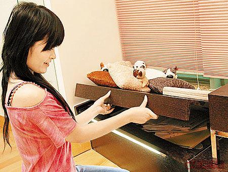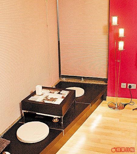 屋主江小姐曾在外國居住,香港居住環境比外國小,因此她喜歡簡約的裝修設計:「屋企只得500多呎,地方細,簡單的布置會令地方更見用,若裝修太複雜的話,只會增加壓迫感。」她要求的是一個簡單舒適的安樂窩,故着設計公司多用座地式裝修,以貼近在外國時的生活方式。碰巧她居住的帝后華庭高層,窗台上有一幅6呎乘8呎8吋的大玻璃,每當夜幕低垂,香港夜景盡收眼底,景觀一流,設計公司就好好利用這窗台,加地台與窗簾做成一個日式小露台,再配合柔和的燈光,自成一角構成一欣賞夜景的小天地。