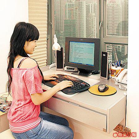 書房其實是大廳的一部份,以玻璃間開,目的是充份利用廳中的光線,延續那種舒適氣氛。窗台變成書枱,日間可有效利用天然光,書架下藏燈,燈管不外露,燈光柔和而充足,再加上一些特色的小擺設作點綴,營造出一個舒適而輕鬆的工作空間。