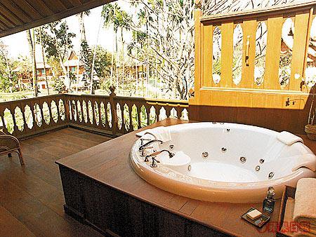 這排的房間都是獨立屋,每家門前總有一塊稻田,司機解釋:「泰北出產的米飯,除了供應本土,還外銷全球,稻田跟民房總像唇齒相依,田的面積反映了屋主的財富。」我的雖這麼小,但再少也有青蛙聚集,還未進屋,先來咕嚕咕嚕的蛙叫聲,歡迎我。一開房門,不得了,我給那開放式按摩浴池吸引住,我馬上校水,又到樓下客廳,把生果盤端上來,把裝飾用的蘭花,拋進泡泡池中,把頭挨緊着缸邊,好好享受。這一挨,發現缸裏的水開始變色,不就是ColourTherapy嗎?