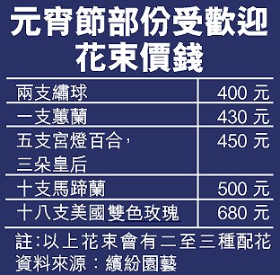 【記者陸羽平報道】視為中國情人節的正月十五元宵節,向愛侶送上一束繽紛多彩的花已成新一代潮流。有花店指出,部份元宵節送花定單早於過年前已訂下,預計今年元宵節的鮮花生意會較去年上升六成。