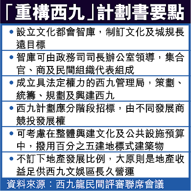 【本報訊】佔地達四十公頃的西九龍文娛藝術區發展計劃引起公眾激烈爭論,更被批評由地產發展商主導,西九龍民間評審聯席會議指香港缺乏長遠文化及城規目標,西九落成也只是徒具空殼的硬件,聯席呼籲港府暫停目前「三選一」諮詢,建議先設立「文化都會智庫」進行研究及吸納民間意見,作為籌建及發展西九的「大腦」及注入「靈魂」,聯席本周將約晤政務司司長曾蔭權介紹有關建議。 記者:羅偉光