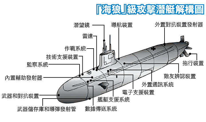 海軍表示,造價約二百五十億港元的「卡特」號,魚雷艙除可發射「戰斧」巡航導彈外,是一艘經改裝的核潛艇,艇身比另兩艘「海狼」級長一百呎,加建的掛艙可容納多艘小型潛艇,共搭載五十名海豹特種部隊成員。