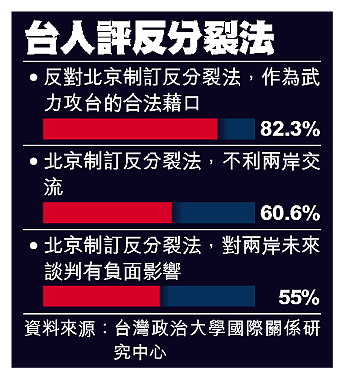政大的民調結果,與台灣行政院大陸委員會去年十二月所做的類似調查接近。當時,陸委會發現,近七成五受訪反對北京制訂反分裂法,強迫台灣與大陸統一。陸委會發言人邱太三昨天指出,政大的調查顯示,台灣公眾不滿大陸的威權做法,北京若強行立法台灣民眾是無法接受的,台灣社會也可能出現較激的反應。