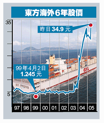 直至○三年,中國經濟增長及出入口表現強勁,帶動全球航運業復甦,航運股才受到市場資金追捧。東方海外的股價亦逐步上升,上月開始又再度企穩在三十元以上。